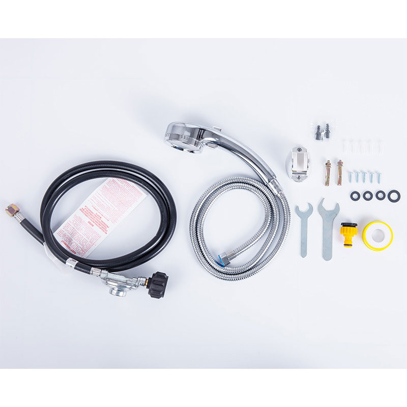 5) Celá sada príslušenstva pre kemping, vrátane plynovej hadice a regulátora, sprchovej hadice, sprchovej hlavice atď.